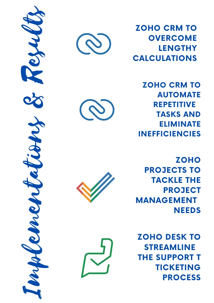 To resolve the challenges faced by the company, we implemented Zoho CRM, Zoho Projects, and Zoho Desk for them to automate and optimize various business processes, which are listed below: